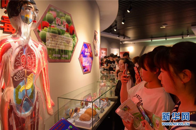 6月26日,在湖北省宣恩縣未成年人法治教育和禁毒警示教育基地,學(xué)生通過人體模型了解吸食毒品的危害。新華社發(fā)(王俊攝)