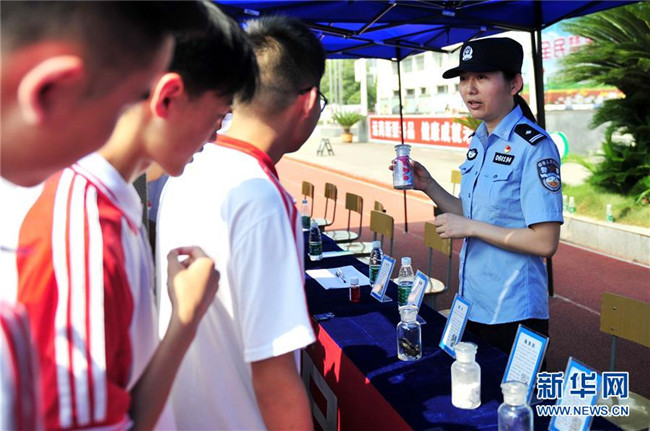 6月26日,民警向湖北省宜昌市夷陵區(qū)東湖高中學(xué)生宣講各類毒品的危害。新華社發(fā)(張國榮攝)