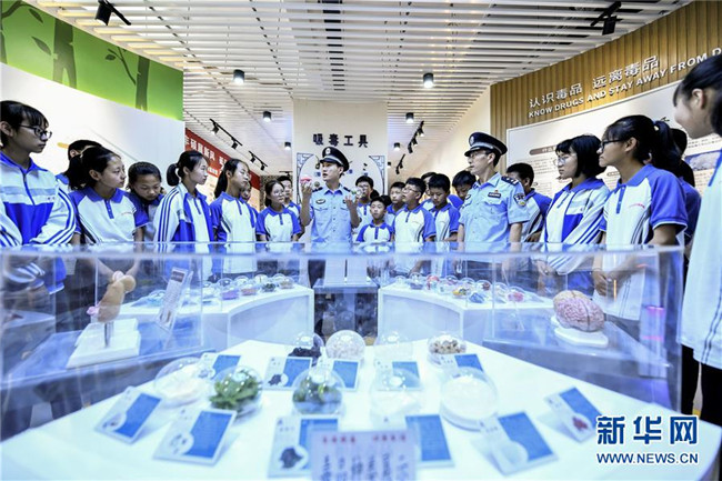 6月26日,在山東省棗莊市臺兒莊古城中學(xué)的禁毒教育基地,民警向?qū)W生介紹新型毒品的種類、特征和危害。新華社發(fā)(高啟民攝)