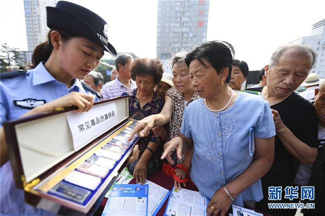 6月26日,民警在安徽省亳州市魏武廣場向市民講解禁毒知識及毒品的危害。新華社發(fā)(劉勤利攝)