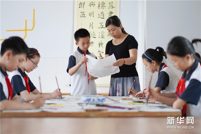 6月26日,內(nèi)丘縣實驗小學老師在指導學生練習國畫創(chuàng)作。新華社記者 朱旭東 攝