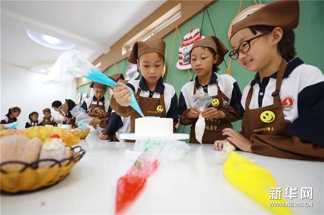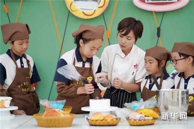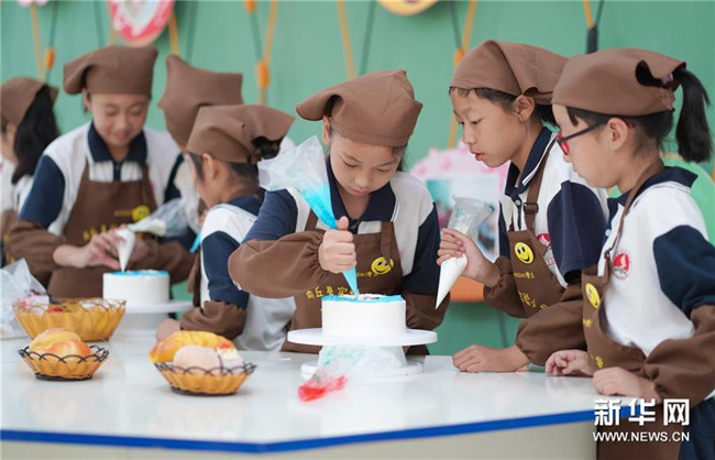 6月26日,內(nèi)丘縣實驗小學學生在烘焙課堂制作糕點。 新華社記者 朱旭東 攝