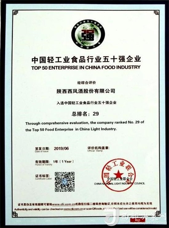 西鳳股份公司榮獲"2018年度中國輕工業(yè)食品行業(yè)五十強企業(yè)"殊榮