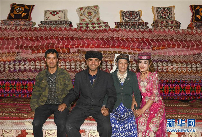 這是大同鄉(xiāng)阿依克日克村二小隊村民瑪達(dá)孜孜·由力達(dá)西(左二)一家在安居房內(nèi)的合影(6月17日攝)。新華社記者胡虎虎攝