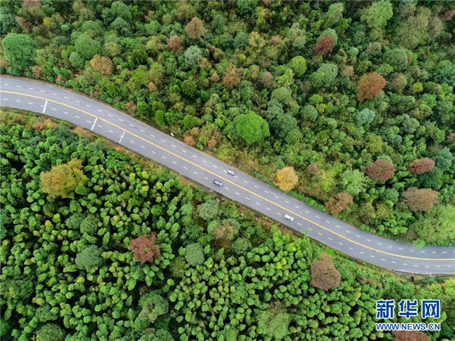 車輛行駛在國家第一條四車道盤山公路泰井高速上(2018年11月21日無人機(jī)拍攝)。新華社記者 胡晨歡 攝