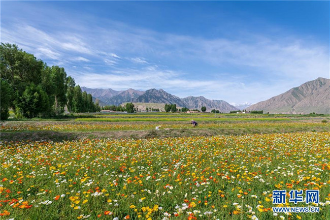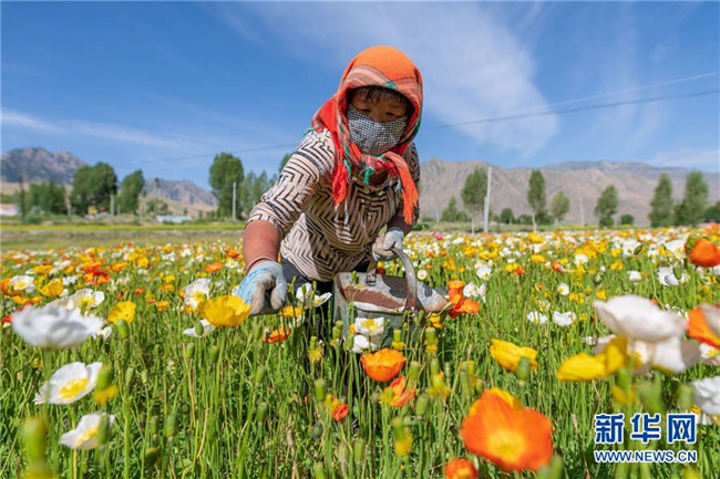 7月6日,甘肅省高臺(tái)縣新壩鎮(zhèn)紅沙河村村民在花田中勞作。 新華社發(fā)(鐘曉亮 攝)