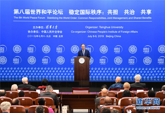7月8日,以“穩(wěn)定國(guó)際秩序:共擔(dān)、共治、共享”為主題的第八屆世界和平論壇在清華大學(xué)舉行,國(guó)家副主席王岐山出席開幕式并致辭。 新華社記者 申宏 攝