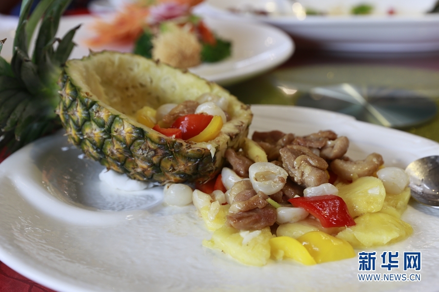 本次荔枝宴共有泮塘綠叢荔荷雞、魚潛荔水芳四溢,以及禾桿藏珠荔香透等10道菜肴。新華網(wǎng) 林曉蕾攝