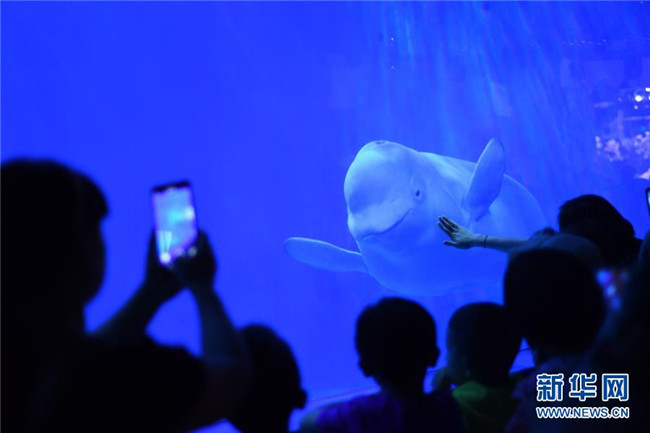 7月10日,游客在海洋世界觀看動物表演。新華社發(fā)