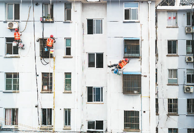 2019年5月14日,江蘇海安高新區(qū)中心街道一老舊小區(qū)改造工程正在緊張施工中,施工人員正在對(duì)外墻面進(jìn)行刷新。(翟慧勇攝)