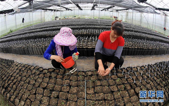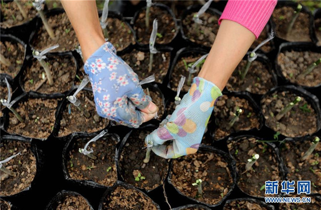在廣西融安縣大良鎮(zhèn)古蘭村古蘭屯大棚基地,村民在嫁接金桔苗(4月12日攝)。  新華社記者 黃孝邦 攝