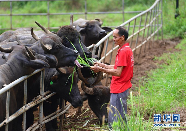 在廣西融安縣大良鎮(zhèn)古蘭村古蘭屯養(yǎng)?;兀?8歲的韋肇翠在喂牛(8月18日攝)。韋肇翠是養(yǎng)?;氐娘曫B(yǎng)員,每個(gè)月有2800元的工資。 新華社記者 黃孝邦 攝