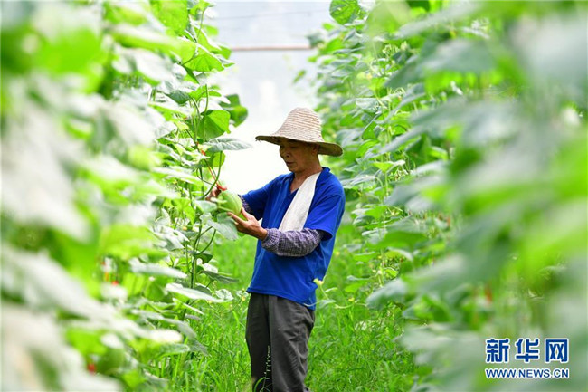 在廣西融安縣大良鎮(zhèn)古蘭村古蘭屯大棚基地,62歲的黃顯亮查看甜瓜生長情況(8月18日攝)。黃顯亮是大棚基地的技術(shù)員,每個(gè)月有3000多元的工資,已于2018年實(shí)現(xiàn)脫貧。  新華社記者 黃孝邦 攝