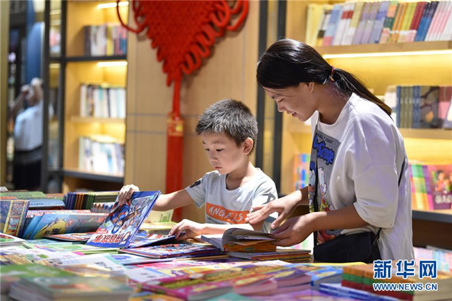 8月18日,在河北省定州市新華書店,小朋友在家長的陪伴下挑選圖書。