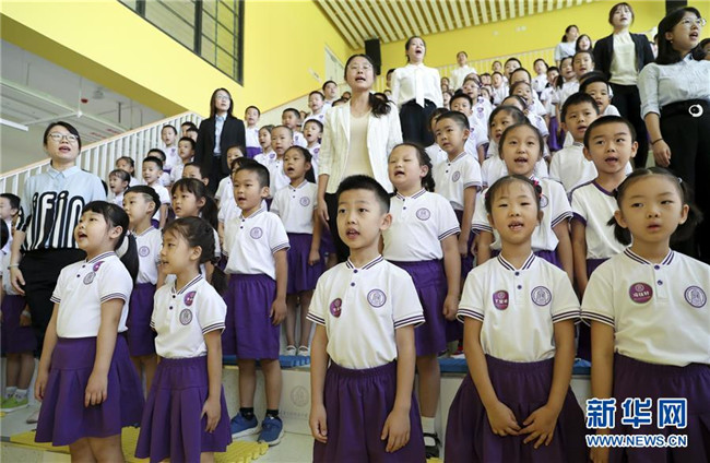 9月1日,新成立的清華大學(xué)附屬中學(xué)廣華學(xué)校小學(xué)部首批152名一年級(jí)新生和老師在開學(xué)典禮上高唱國歌。新華社記者 丁海濤 攝