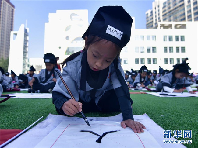 9月1日,青海省西寧市文匯小學(xué)一年級(jí)的學(xué)生們?cè)?ldquo;開筆禮”儀式上。新華社記者 張龍 攝