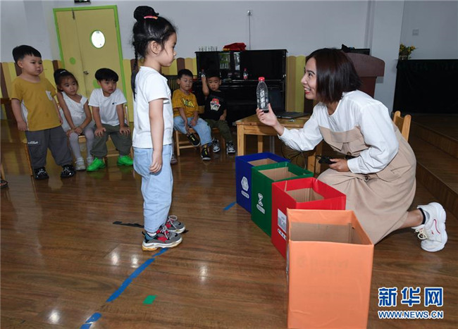 9月4日,老師給孩子們講解垃圾分類的知識。