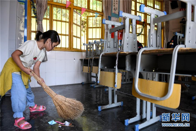 十八洞小學(xué)一年級學(xué)生楊韓雪在下課后打掃教室衛(wèi)生(9月4日攝)。 新華社記者 陳澤國 攝