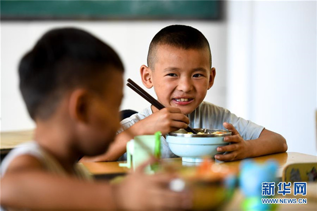 9月5日,十八洞小學(xué)學(xué)生在教室吃午飯。 新華社記者 陳澤國 攝