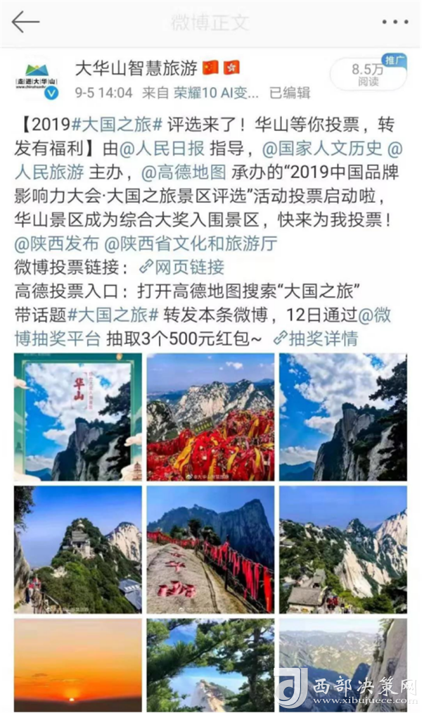 2019大國之旅景區(qū)評選活動由人民日報社指導(dǎo),《國家歷史人文》雜志社、人民旅游主辦,高德地圖承辦,于9月2日正式啟動。此次活動采取大眾投票+高德地圖旅游大數(shù)據(jù)+專家及媒體評審相結(jié)合的形式,得出最終獲獎名單。游客通過新浪微博關(guān)注景區(qū)官博“ 大華山智慧旅游”為華山景區(qū)投票,智旅公司協(xié)助高德地圖完善了華山景區(qū)地圖板塊的校準(zhǔn)和更新,此次活動的開展,華山景區(qū)的品牌影響力和知名度也再次得到提升。