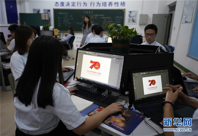 9月18日,邢臺技師學(xué)院的學(xué)生在平面設(shè)計課程上臨摹慶祝中華人民共和國成立70周年活動標(biāo)識。