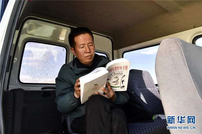 9月25日,青海湖國(guó)家級(jí)自然保護(hù)區(qū)管理局的巡湖觀測(cè)人員王延明在巡湖間隙閱讀中國(guó)鳥(niǎo)類野外手冊(cè)。