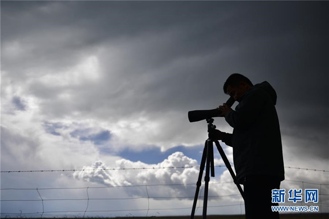 9月23日,青海湖國(guó)家級(jí)自然保護(hù)區(qū)管理局的巡湖觀測(cè)人員楊濤在青海湖畔的尕日拉村觀測(cè)點(diǎn)進(jìn)行觀測(cè)。