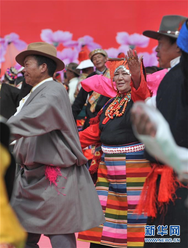 9月29日,演員在聯(lián)歡活動中表演西藏傳統(tǒng)歌舞。新華社記者晉美多吉攝