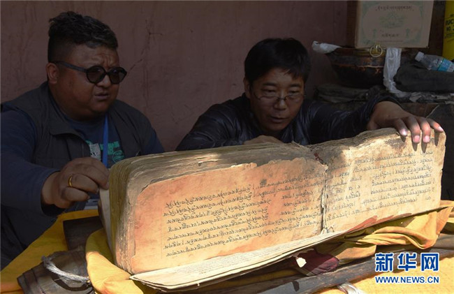 在西藏日喀則市定日縣倫措寺,西藏自治區(qū)古籍保護中心古籍專家在查看古籍文獻(資料照片)。新華社記者春拉攝