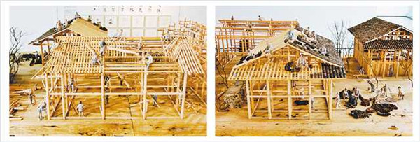 “作品分為動(dòng)工、排扇、立架、安梁、上椽、排瓦、裝修、入住8個(gè)部分,再現(xiàn)了中國(guó)民間木匠的工藝傳統(tǒng)和中國(guó)傳統(tǒng)民居營(yíng)建過程。”孫繼任介紹,為了讓作品呈現(xiàn)樸素而真實(shí)的美感,他們沒有在作品中運(yùn)用釘子或者新材料。“作品全部是純手工制作,建筑為榫卯結(jié)構(gòu),人物是手工塑造并用木柴燒制而成。”