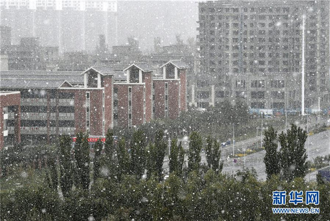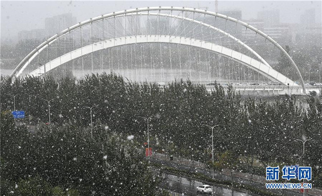 這是在銀川市街頭拍攝的雪景(10月14日攝)。當日,寧夏銀川市迎來降雪天氣。寧夏氣象臺發(fā)布暴雪藍色預警,提醒市民注意交通安全、做好防寒、防滑和清雪工作。新華社記者王鵬攝