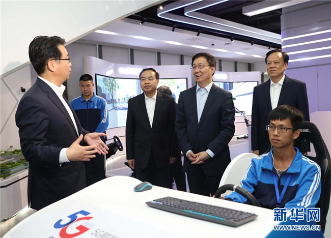 10月14日至15日,中共中央政治局常委、國務(wù)院副總理韓正在重慶市調(diào)研。這是10月15日,韓正來到禮嘉智慧公園,了解園區(qū)開發(fā)建設(shè)情況,體驗智能機器人和5G技術(shù)在遠程駕駛、教育、旅游等方面的應(yīng)用。 新華社記者 劉衛(wèi)兵 攝