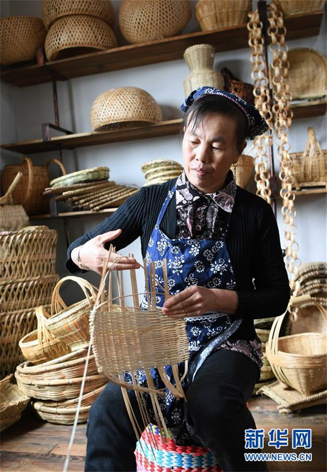 10月16日,團(tuán)結(jié)村的“巧媳婦”袁悅花在編織竹制家庭用具。 新華社記者 楊宗友 攝