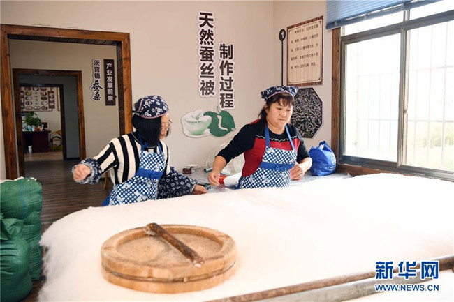 10月16日,團(tuán)結(jié)村的“巧媳婦”龔粉珍(右)和張會敏在制作蠶絲被。 新華社記者 楊宗友 攝