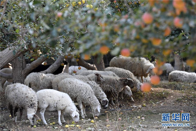 10月24日,羊群在敦煌市郭家堡鎮(zhèn)一處果園里覓食。新華社記者 馬寧 攝