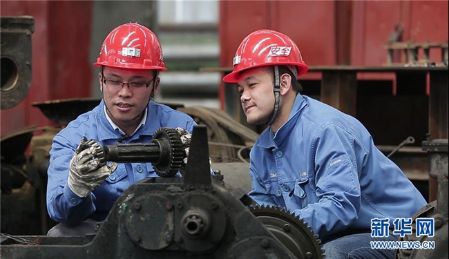 全國人大代表、山西焦煤西山煤電杜兒坪煤礦的董林(左)為職工講解設備構造和傳動原理(2018年4月25日攝)。新華社發(fā)