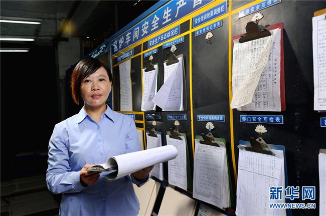 首批農(nóng)民工全國人大代表之一胡小燕在曾經(jīng)工作過的陶瓷廠檢查職工權益保護工作(2013年11月5日攝)。新華社記者 劉大偉 攝