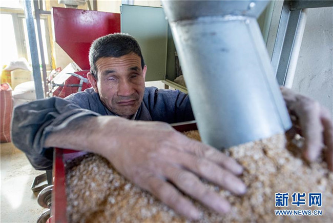 馬騰俊在用手測(cè)試麥子的好壞(10月25日攝)。 新華社發(fā)(楊植森 攝)