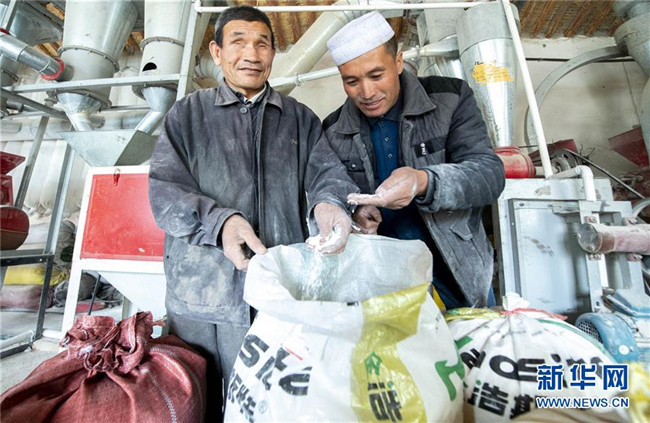 馬騰?。ㄗ螅┖颓皝?lái)磨面的當(dāng)?shù)卮迕窆餐瑱z查新磨出的面(10月25日攝)。 新華社發(fā)(楊植森 攝)
