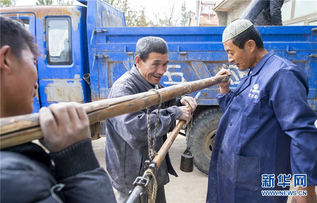 馬騰?。ㄖ校┰谟|摸秤桿讀取面粉的斤數(shù)(10月25日攝)。新華社發(fā)(楊植森 攝)