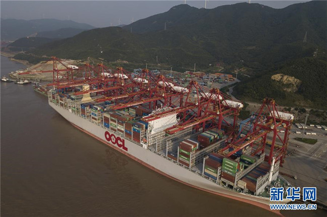 一艘貨輪停靠在寧波舟山港穿山港區(qū)集裝箱碼頭(2018年6月13日無人機(jī)拍攝)。新華社記者 黃宗治 攝
