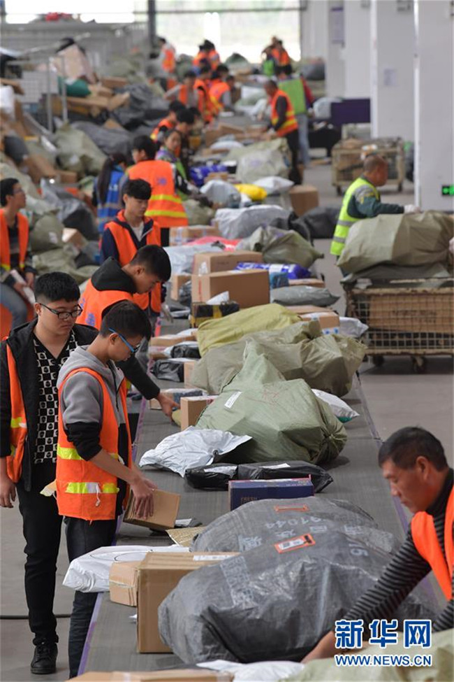 在貴州省龍里縣一快遞公司的自動化分揀車間,揀配員在流水線上工作(2018年11月13日攝)。新華社發(fā)(龍毅 攝)