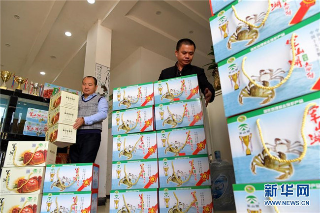 在江西省進賢縣軍山湖大閘蟹線上銷售網(wǎng)點,工作人員準備將裝箱的大閘蟹發(fā)貨給網(wǎng)購的顧客(2018年11月9日攝)。新華社記者 彭昭之 攝