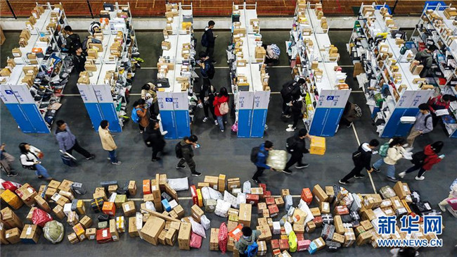 南京航空航天大學師生在校園臨時快遞取件點領取快遞(2018年11月13日攝)。為應對“雙十一”大量校園快遞包裹,南京航空航天大學在原“快遞超市”的基礎上,將學校體育中心室內(nèi)網(wǎng)球場搭建為臨時快遞取件點,方便在校師生取件。新華社記者 李博 攝
