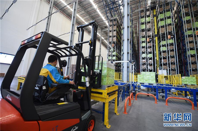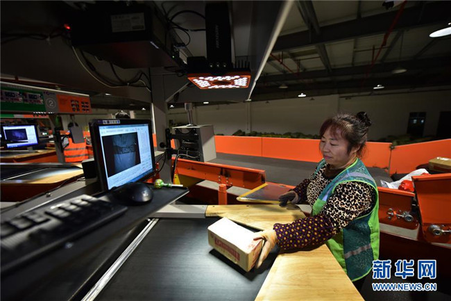 工作人員在南京市雨花經(jīng)濟開發(fā)區(qū)一家智慧物流基地內(nèi)忙碌(2016年11月3日攝)。該物流基地建筑面積達20多萬平方米,可存儲商品2000萬件,日處理包裹181萬件。整個物流基地實現(xiàn)全流程自動作業(yè),從訂單生成到商品出庫,最快可縮短到30分鐘。新華社發(fā)