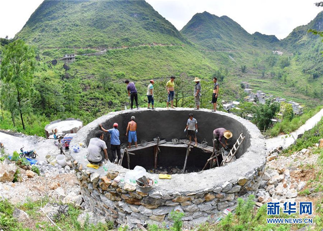 在廣西大化瑤族自治縣板升鄉(xiāng)弄勇村,群眾在修建家庭水柜(2017年9月2日攝)。  新華社記者 黃孝邦 攝