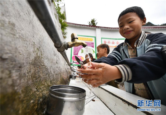 在廣西大化瑤族自治縣板升鄉(xiāng)八好小學(xué),同學(xué)們在用自來水洗餐具(11月13日攝)。  新華社記者 黃孝邦 攝