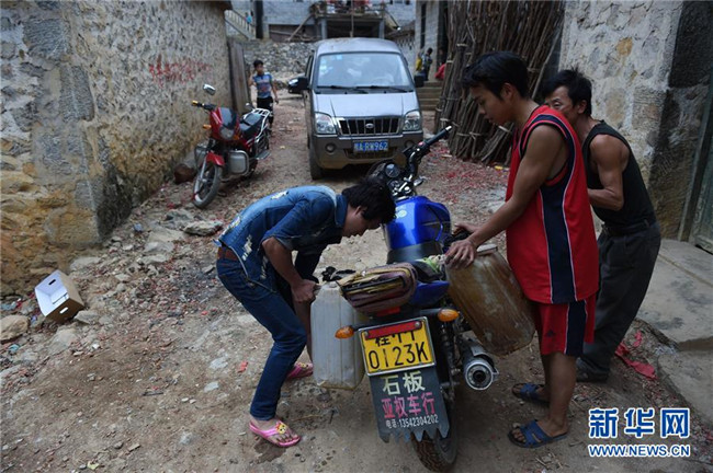 在廣西大化瑤族自治縣板升鄉(xiāng)弄勇村弄朝屯,村民到鄰村運(yùn)水飲用(2015年2月28日攝)。如今,弄朝屯幾乎家家戶戶都修建了家庭水柜。 新華社記者 黃孝邦 攝