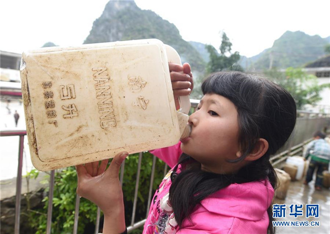 在廣西大化瑤族自治縣板升鄉(xiāng)八好小學(xué),一名學(xué)生喝水桶里的雨水(2014年11月24日攝)。八好小學(xué)有400多名學(xué)生,曾僅有一個(gè)不足100立方米的水柜,用于收集儲(chǔ)存樓頂?shù)挠晁?,學(xué)生需定期定量用水。遇到長時(shí)間不下雨,學(xué)校需要到鄉(xiāng)政府所在地運(yùn)水。如今,學(xué)校修建了5個(gè)大水柜,并從兩公里外引泉水到校園,飲水難問題得到解決。  新華社記者 黃孝邦 攝