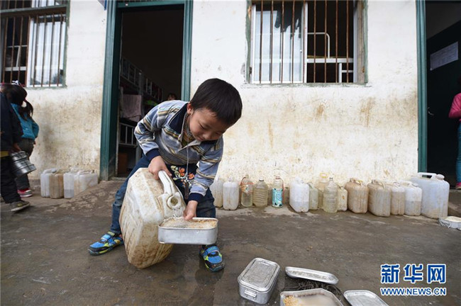 在廣西大化瑤族自治縣板升鄉(xiāng)八好小學(xué),一名學(xué)生用儲(chǔ)備在水桶里的雨水淘米煮飯(2014年11月24日攝)。八好小學(xué)有400多名學(xué)生,曾僅有一個(gè)不足100立方米的水柜,用于收集儲(chǔ)存樓頂?shù)挠晁?,學(xué)生需定期定量用水。遇到長時(shí)間不下雨,學(xué)校需要到鄉(xiāng)政府所在地運(yùn)水。如今,學(xué)校修建了5個(gè)大水柜,并從兩公里外引泉水到校園,“飲水難”問題得到解決。 新華社記者 黃孝邦 攝